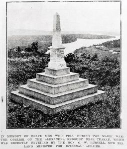 This memorial obelisk stands near the entrance to the site. It is dedicated to the imperial and colonial troops, known and unknown, who died in the Franklin district in 1863–64. The etching depicts the Maori waka plying up and down the Waikato river, often engaged in commercial activities of trading flax and grains grown in the verdant fields of the North Waikato, here all under the watchful gaze of the redoubt on the hill above.